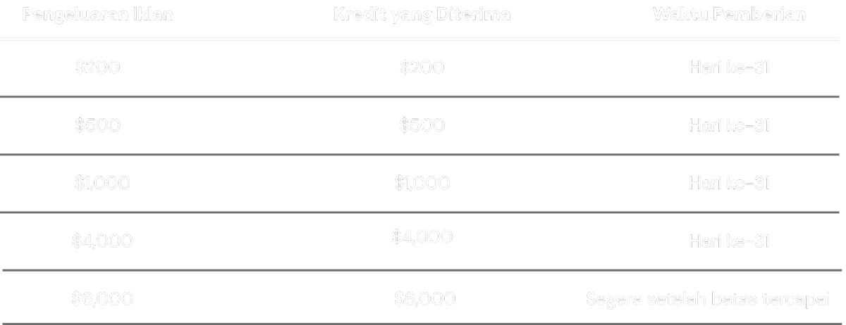Jika Anda tidak mencapai salah satu batas pengeluaran ($200, $500, $1.500, atau $6.000) dalam 30 hari setelah pendaftaran, maka Anda tidak akan menerima kredit iklan dari promosi ini.